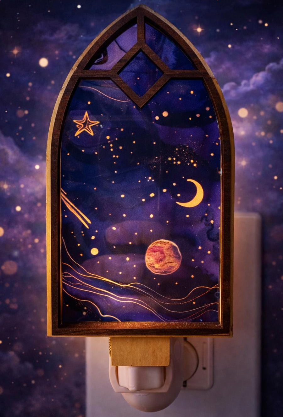 The nightlight is composed of two beautifully layered elements. The bottom layer is a 0.3mm acrylic panel laser cut and sublimated with a deep celestial night sky, showcasing twinkling stars, distant planets, and a gentle crescent moon. Overlaid with a 1/4 inch wooden laser-cut cathedral window silhouette, it highlights clean, elegant lines and natural wood grain, adding warmth and charm to its cosmic design.